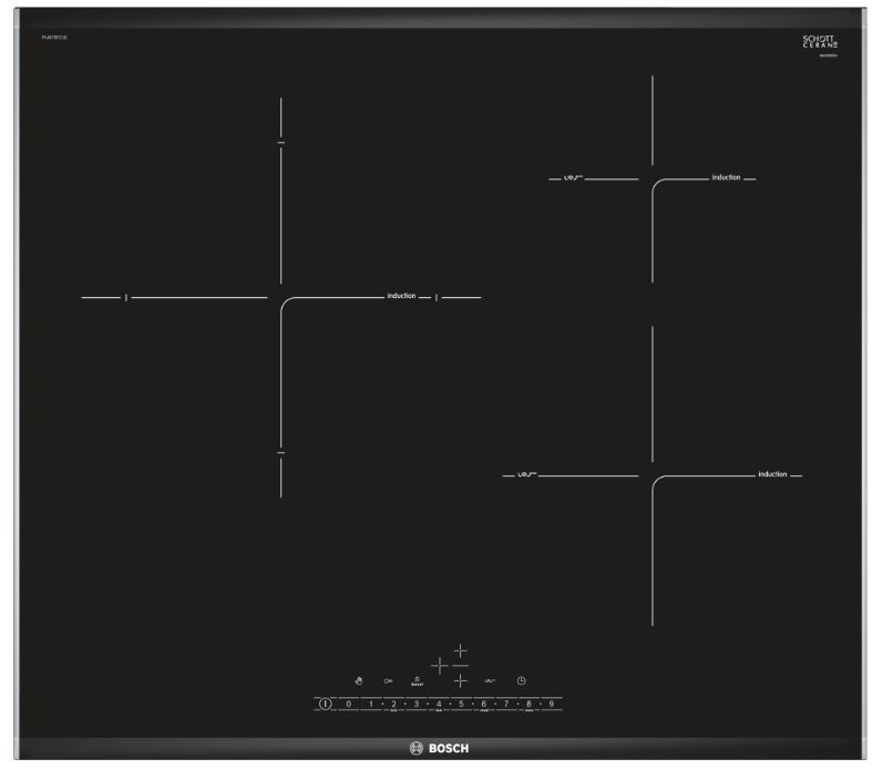 Bếp từ 3 vùng nấu Bosch PIJ675FC1E thiết kế bảng điều khiển chìm, với duy nhất nút nguồn được in trên mặt kính. Sau khi khởi động bếp bằng nút nguồn, toàn bộ giao diện điều khiển bằng đèn LED sẽ hiển thị đầy đủ. Điều khiển chìm có 2 tác dụng. 1 – Dễ dàng thay mặt kính khi vỡ mà không lo ngại lệch giao diện; 2 – Mặt kính càng tối giản, thì càng đẹp, sang trọng. Đây là xu hướng thiết kế mới của bếp từ trong tương lai.