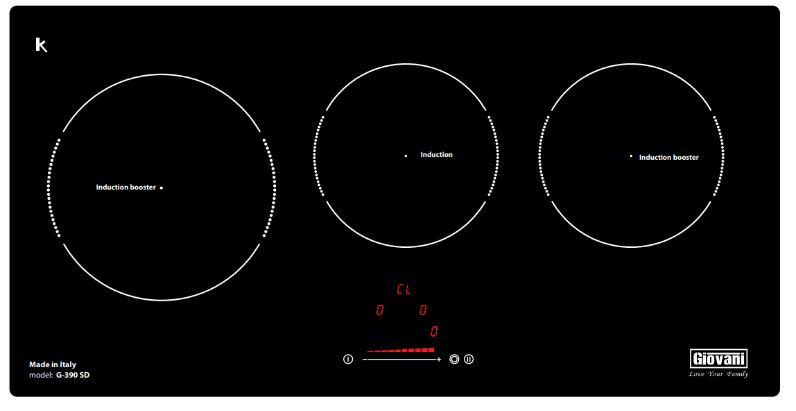 Giovani G-390 SD gồm 3 vùng nấu với tổng công suất là 6400W, vùng nấu hồng ngoại phải đường kính mâm từ 140cm và 210cm có công suất 1000W và 2200W, vùng nấu giữa có công suất 1400W, vùng nấu trái phảicó công suất 2000W khi kích hoạt tính năng Booster công suất đạt 3000W. Chức năng Booster ở vùng từ nấu siêu nhanh, tuy nhiên thời gian tối đa mặc định dùng chức năng này là 10 phút/lần tránh quá tải.