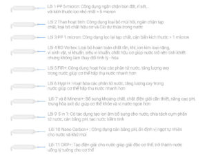 | Lõi chức năng: Lõi 10: Nano Carbon+, Lõi 11: ORP+, Lõi 5: FIR+, Lõi 6: HypH+, Lõi 7: Mineral+, Lõi 8: Mineral+, Lõi 9: 5 in 1 |